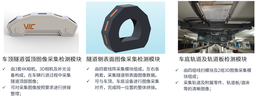 系统由车顶隧道弧顶图像采集检测模块、隧道侧表面图像采集检测模块、车底轨道及轨道板检测模块联合组成,车内设置有采集控制及识别模块,并设置有车轮传感器,以方便车辆定位。具体模块如下所示: