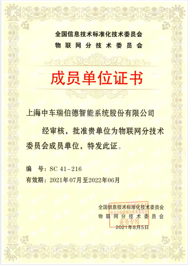 上海中车瑞伯德成为全国信息技术标准化技术委员会物联网分技术委员会成员单位